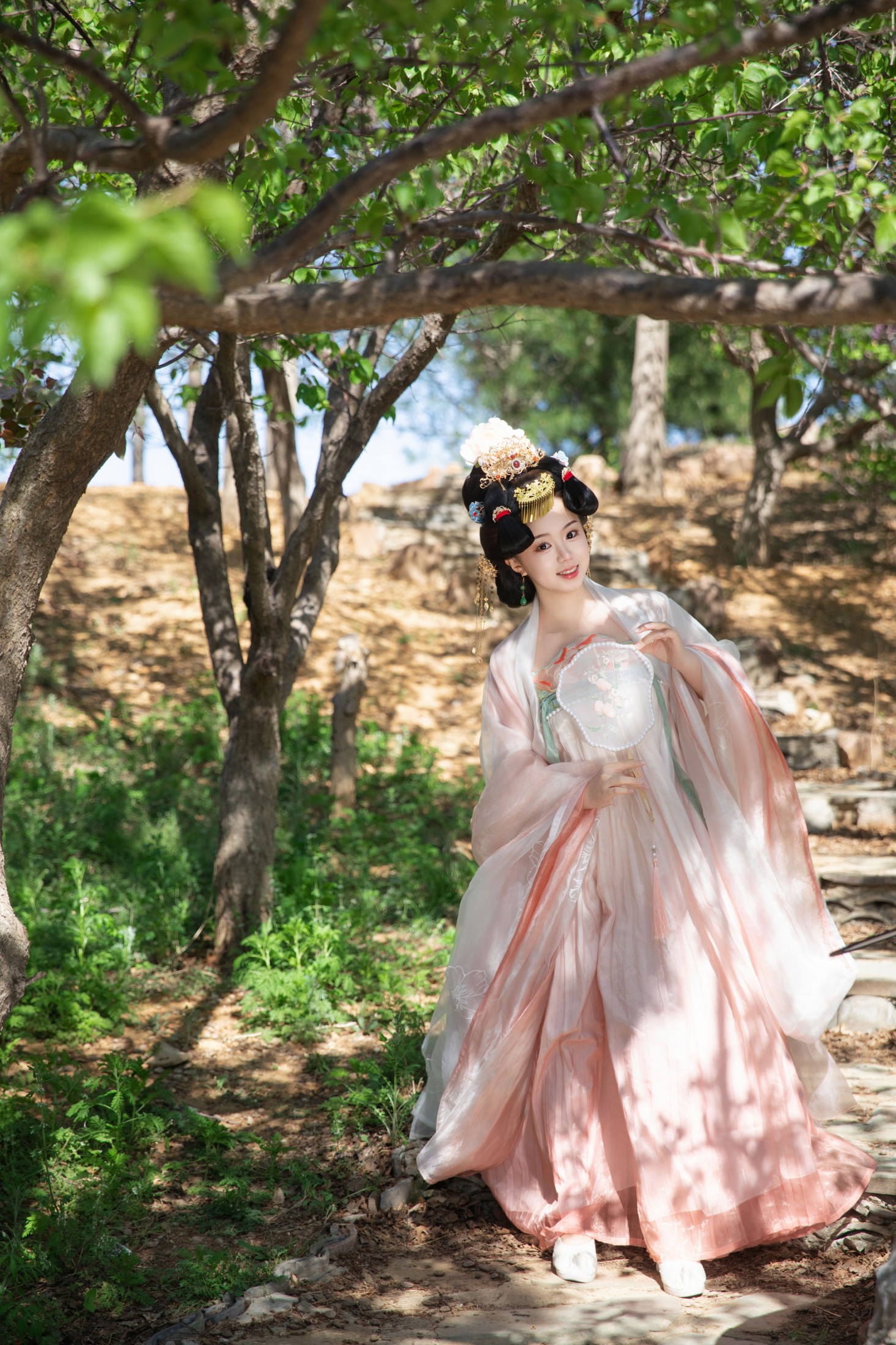 这组照片以唐代服饰为骨,以四季繁花为魂,铺陈出一幅盛唐仕女游园的鲜活长卷。画面中,女子身着华丽唐制汉服,头戴精致发冠,在牡丹、紫藤等花海间或执伞浅笑、或凭花伫立,衣袂的层叠褶皱与花卉的秾艳娇美交相辉映,将盛唐的雍容气度与花事的烂漫诗意融为一体。